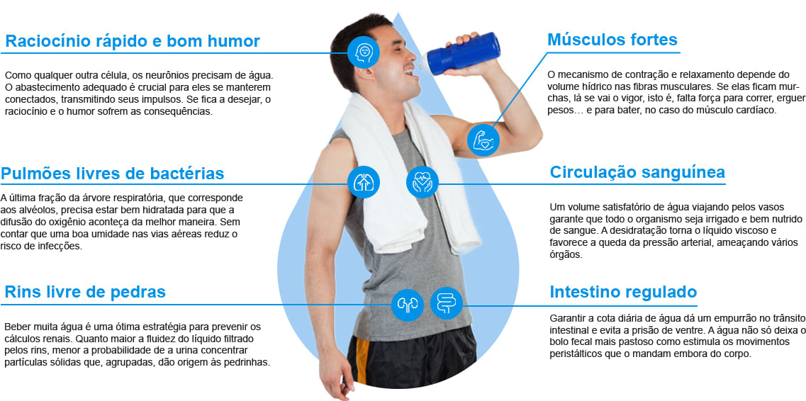 Um volume satisfatório de água viajando pelos vasos garante que todo o organismo seja irrigado e bem nutrido de sangue. A desidratação torna o líquido viscoso e favorece a queda da pressão arterial, ameaçando vários órgãos.